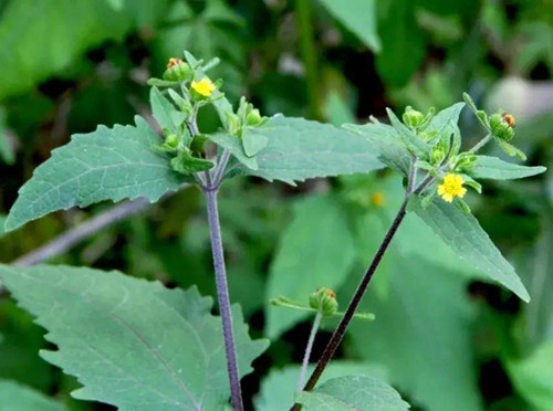 豨莶:一年生草本,高30~100厘米,被白色柔毛。茎直立,方形,常带紫色,枝上部密生短柔毛。叶对生,茎中部叶三角状卵形或卵状披针形,长4~10厘米,宽1.8~6.5厘米,两面被毛,下面有腺点,边缘有不规则的锯齿,顶端一枝梗最短,被紫褐色头状有柄腺毛,舌状花黄色,雌性,稍短,长达2.5毫米,管状花两性。瘦果稍膨胀而常弯曲,长3~3.5毫米,无冠毛。花期5~7月,果期7~9月。