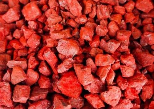 通常为粒状或块状集合体,呈现颗粒状或块片状,颜色为鲜红色或暗红色,具有光泽,且体重质脆。