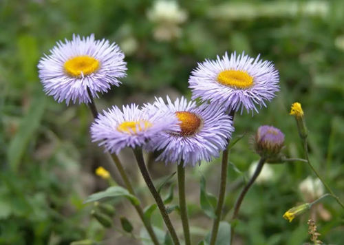 多年生草本。茎被硬毛,兼有贴毛和腺毛。基生叶倒卵状披针形或宽匙形,长1.5~11厘米,全缘,边缘被硬毛,兼有不明显腺毛,稀近无毛,茎生叶少数,窄长圆状披针形或窄披针形,长1~4厘米,基部半抱茎,无柄,上部叶线形。头状花序径2~2.8厘米,单生茎或分枝顶端,总苞半球形,径1~1.5厘米,总苞片3层,线状披针形,长8毫米,绿色,或上部紫红色,外层背而被硬毛,兼有贴毛和腺毛,内层近无毛。外围雌花舌状,3层,长1~1.2厘米,舌片蓝或粉紫色,管部长2~2.5毫米,上郎疏被毛,顶端全缘。中央花两性,管状,黄色。瘦果窄长圆形,扁,密披毛,冠毛淡褐色,2层。花期3~10月。
