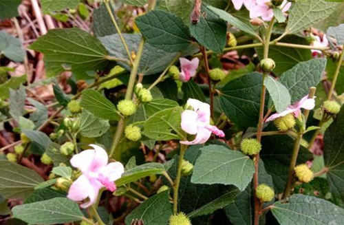 直立半灌木、高达1米。全株被星状毛。叶互生;下部叶心脏形或近圆形,上部叶椭圆形或近披针形,边缘具细锯齿,掌状网脉,叶背中脉基部有明显的腺体。花单生叶腋或稍丛生,副萼5裂,花萼5裂,表面均被毛;花瓣5,粉红色,呈椭圆形;雄蕊多数,合生,花丝连成管状,花药紫红色。蒴果扁球形,密生钩状刺毛。花期5~ 12月;果期6月至次年1月。