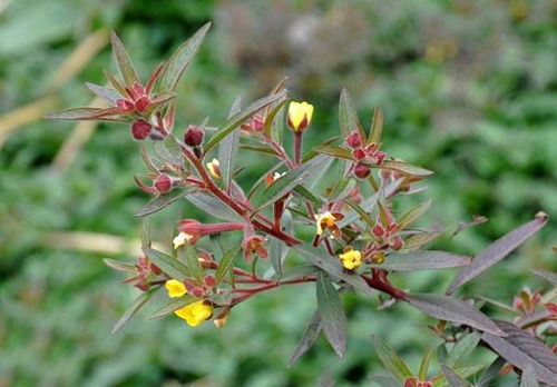 亚灌木状草本。茎稍具纵棱,有毛。叶互生,披针形,长3~16厘米,宽l~ 2.5厘米,先端渐尖,基部渐狭;叶柄短或无。花腋生,无花梗;萼裂片4;花瓣4,黄色,倒卵形,长8~ 10毫米,先端钝或微凹,具4对明显的脉纹;雄蕊8;子房4室。蒴果圆柱形,有毛、棱;绿色或淡紫色。种子多数。初夏开花。