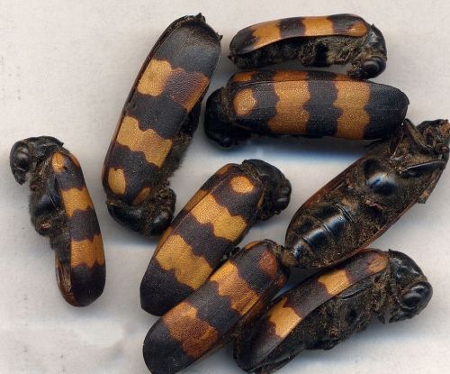 南方大斑蝥:体长1.5~3.0厘米,黑色,被黑绒毛。头部具粗密刻点,复眼大,略呈肾形。触角l对。前胸长略大于宽。鞘翅端部阔于基部,黑色,翅基部有2个大黄斑;翅中央前后各有一黄色波纹状横带。足有黑色长绒毛,前足、中足跗节均为5节,后足跗节为4节。腹面亦具黑色长绒毛。黄黑小斑蝥:与南方大斑蝥相似,体较小。