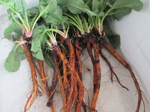 多年生草本,高约1米。主根粗大肥厚,黄色。茎直立,紫绿色,有多数纵沟。基生叶卵形至卵状长椭圆形,长20~30厘米,宽10~20厘米,先端钝或钝圆,基部心形,下面有小瘤状突起,有长叶柄,托叶鞘膜质,早落;茎生叶卵状披针形,向上渐小,叶脉红色。花成簇集成圆锥状总状花序;花被片6,淡绿色,2轮,内轮花被片圆心形,每边具4~7齿;雄蕊6;子房三角卵状,花柱3,柱头毛状。瘦果卵形,有3棱,褐色,包于增大的内轮花被内。花期5~6月,果期6~7月。